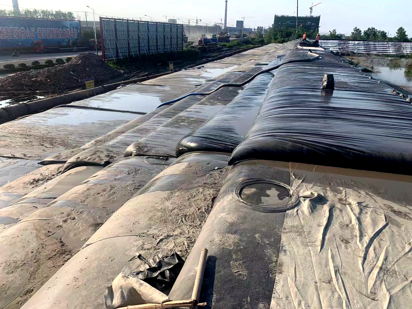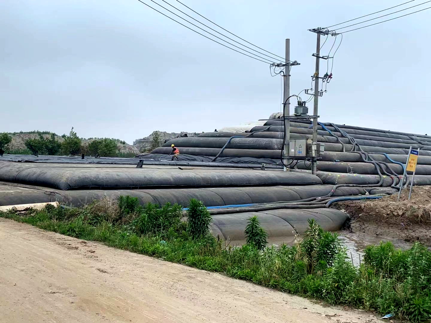 截止目前,現(xiàn)場(chǎng)施工用水,用電已解決,施工區(qū)域除兩處居民房未拆遷,其余均搬離工作區(qū)域,充填袋也正平穩(wěn),快速地往前推進(jìn)。