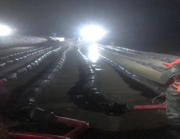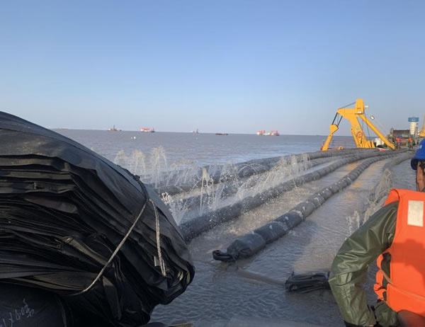 截至4月22日,方駁126已完成要求的所有沙肋軟體排的施工,包括后期新增的7張軟體排。而且在低潮位,船上還抽調人手對CD0+000-CD0+475區域進行溝槽段填槽,至4月底進度已過半。目前方駁126正在抓緊時間進行底層通袋的鋪設充灌,力爭實現1天2個潮水鋪設2個通袋,在最短的時間完成剩余的工作任務。