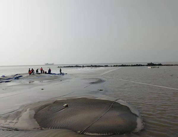 南通通州灣港區三港池1#-3#泊位碼頭工程位于通州灣作業區北部港區,引堤與已建“通州灣新出海口一期通道工程”順接。引堤總長2982米,堤頂高程為9.5米,CD段長1981米,寬34米,DE段引堤長1001米,寬20米。引堤采用斜坡式結構形式,堤心采用雙棱體充填袋結構。由于本工程地質是極易起動的粉細砂,需要先鋪設沙肋軟體排進行超前防護。